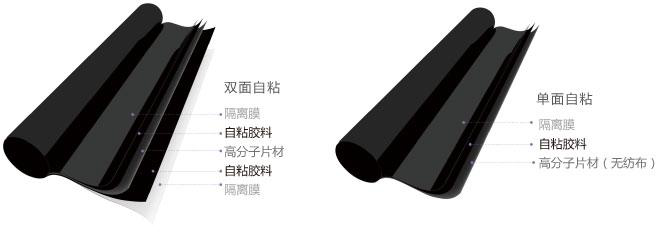 GCMBA(MAC)高分子自粘膠膜復(fù)合防水卷材按粘結(jié)表面分為單面自粘(S)、雙面自粘(D),按施工方式分為預(yù)鋪(Y)、濕鋪(W)。