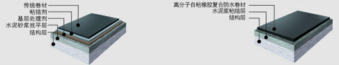 普通的自粘卷材勉強(qiáng)能與混凝土基面實(shí)現(xiàn)牢固粘結(jié),但其抗穿刺、延伸率等物理性能相對(duì)較弱;普通的高分子卷材具有良好的物理性能,但其大多數(shù)與基面不易粘結(jié),采用空鋪或機(jī)械固定施工,常用于外露式屋面,在隱蔽工程中,易發(fā)生“竄水”現(xiàn)象。
